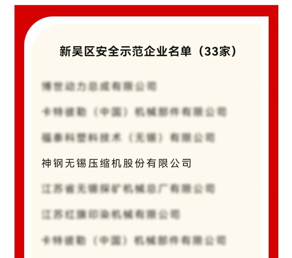 近日,無錫市新吳區(qū)應急管理局組織開展了全區(qū)安全生產(chǎn)示范企業(yè)評選認定工作,經(jīng)企業(yè)自愿申報、各主管街道應急管理部門推薦、現(xiàn)場審查、評委會討論、公示等程序,神鋼無錫壓縮機股份有限公司榜上有名,獲評“安全示范企業(yè)”。